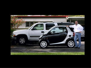 The document humorously imagines small, fuel-efficient versions of popular sports cars being branded with "Smart" names, such as the Smorsche, Smamborghini, and Smerrari. It pokes fun at the idea that people may soon only have small, efficient cars to choose from rather than wanting to buy a classic 409 car.