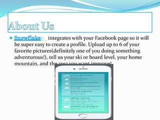 Snowflake is a location-based meet-up app designed for skiers and riders to connect based on ability levels and preferences. The app integrates with Facebook for easy profile creation and offers features like uploading adventure photos and sharing improvement areas. Version 1.5 is launching in mid-November with a new design, improved navigation, and additional features.