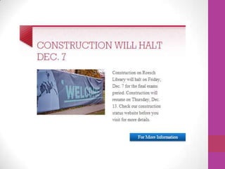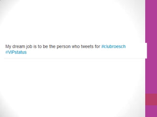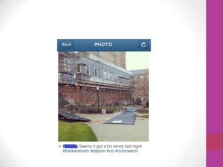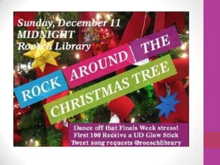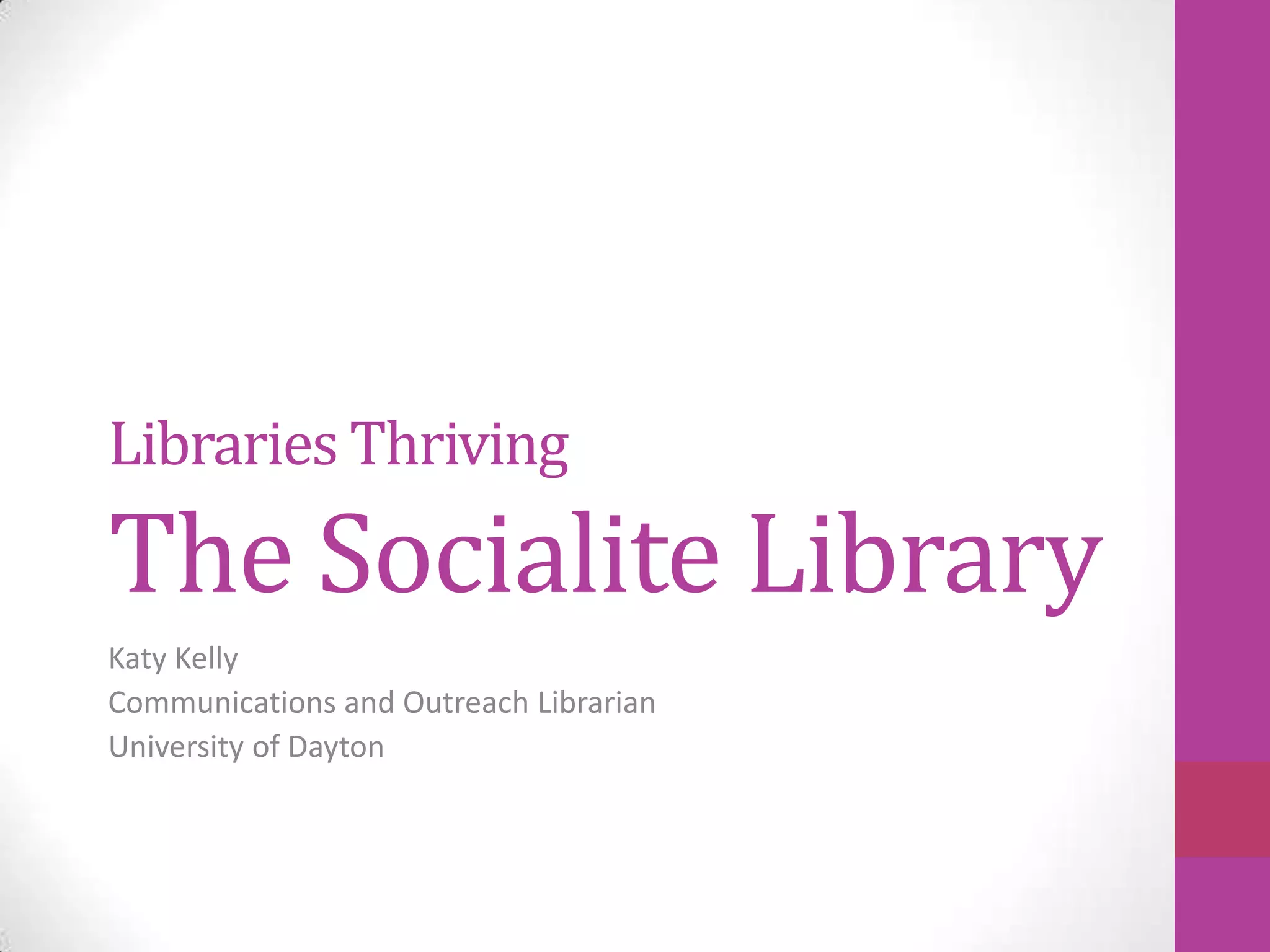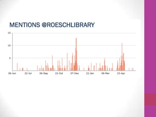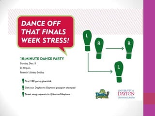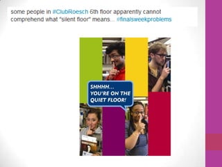 The document outlines strategies for enhancing library engagement through social media, emphasizing the importance of guest communication and understanding patron needs. It highlights specific initiatives like contests to encourage participation and positive experiences during high-stress times, such as finals week. The session is presented by Katy Kelly from the University of Dayton, focusing on outreach and marketing within a vibrant student community.