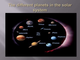This document lists the planets in our solar system, along with some additional information about the sun, moon, and Neil Armstrong being the first person to walk on the moon. It also briefly mentions rockets being used to travel to space and that Jupiter is the largest planet.