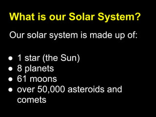 Our solar system consists of one star, the Sun, eight planets, over 50,000 asteroids and comets, and 61 moons orbiting the planets. It is centered around the Sun, which provides heat and light to the planets and contains nearly all of the mass in the solar system. The planets in order from the Sun are Mercury, Venus, Earth, Mars, Jupiter, Saturn, Uranus, and Neptune.