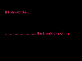 The soldier poet reflects that if he should die in a foreign land, he asks to be remembered not as simply dying abroad, but that a small piece of the foreign field will always be England through his remains resting there. He describes how though his body will be in a distant land, his essence remains truly English as his body was shaped by England and he retains memories of his homeland. He hopes to be at peace in death as his spirit returns to the eternal mind under an English heaven.