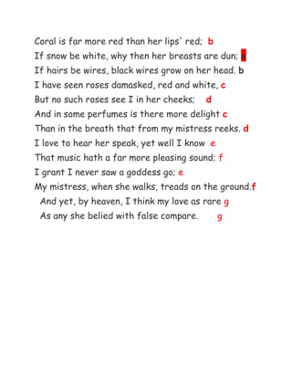 The document discusses the origins and types of sonnets. It states that the sonnet originated in Italy and is associated with the poet Petrarch. The Italian or Petrarchan sonnet has 14 lines divided into an 8 line octave with a rhyme scheme of abba abba, followed by a 6 line sestet with a rhyme scheme of cde cde. The English or Shakespearean sonnet was introduced later and has a rhyme scheme of abab cdcd efef gg. It provides an example of Shakespeare's sonnet comparing his mistress unfavorably to a rose.