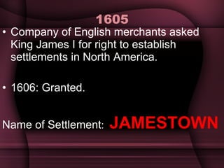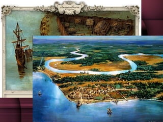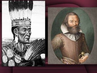 The document summarizes the founding and early history of the Jamestown colony, the first permanent English settlement in North America. It details how the colony struggled at first due to a lack of preparation and farming skills among the colonists. Disease and conflict with the local Powhatan Confederacy led to many deaths in the early years. The colony became more successful after John Smith took control and instituted new rules. The introduction of tobacco as a cash crop by John Rolfe helped the colony become profitable. However, the headright system of rewarding land for transporting colonists led to the rise of indentured servitude and later slavery to meet the need for labor on the large plantations.