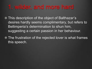 1) This document analyzes a speech from Thomas Kyd's play "The Spanish Tragedy" given by the character Balthazar. In the speech, Balthazar expresses his frustrated love and rejection by Bellimperia.