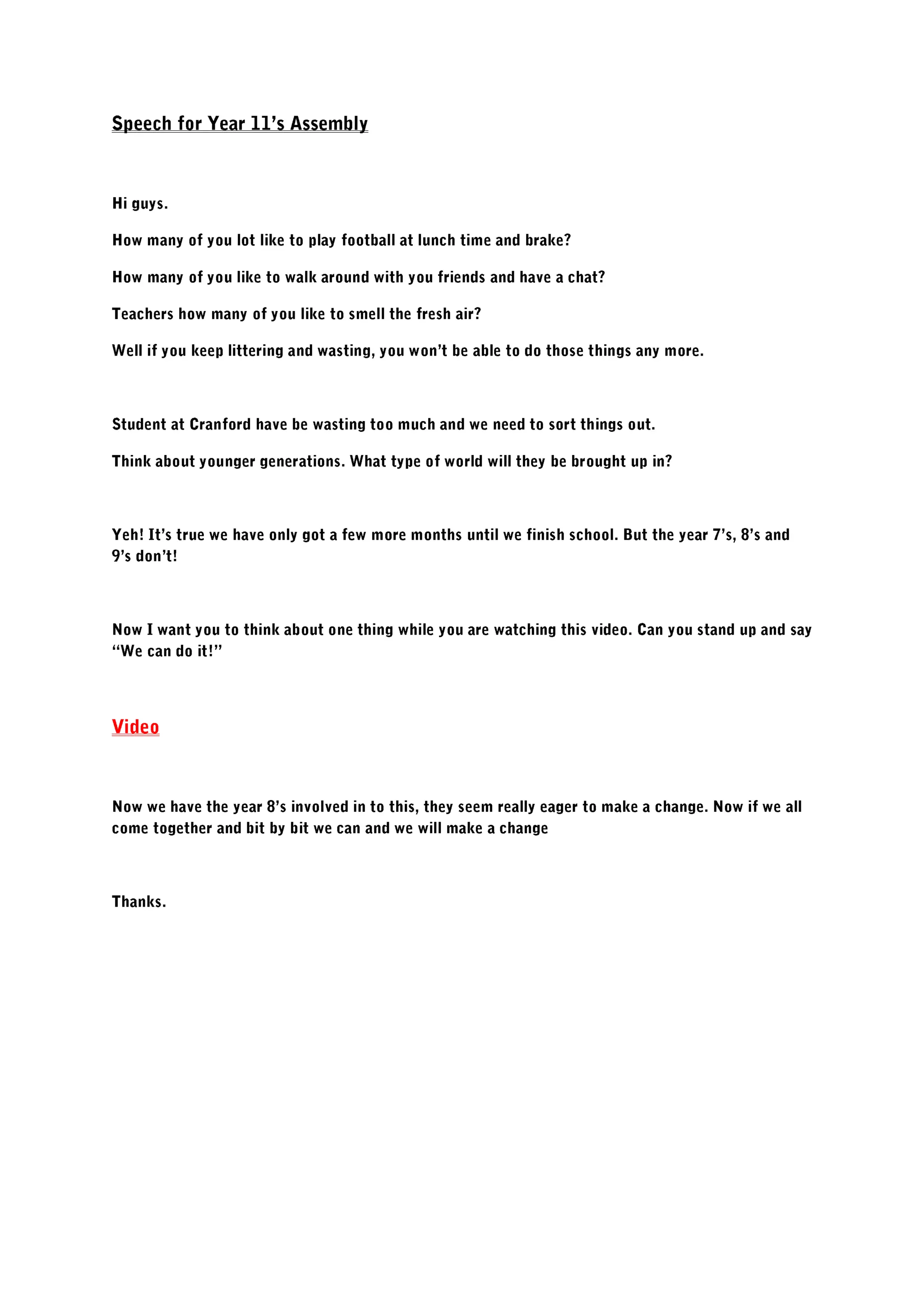 The speaker encourages students to reduce littering and waste at school to protect the environment for future generations. They note that students enjoy playing football and spending time with friends at lunch, but this will not be possible if the environment continues to be degraded by littering. All students, including those in lower years, are called on to work together to make positive changes through small, ongoing efforts.