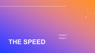 The document defines speed as the distance traveled by an object per unit of time. Constant speed means an object covers equal distances in equal time intervals. The speed of an object can be calculated using the equation: Speed = Distance / Time. If distance is measured in meters and time in seconds, then speed has units of meters per second (m/s).