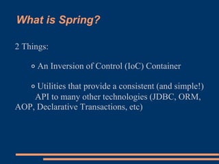 The document provides an introduction to the Spring Framework, which is an Inversion of Control container and utilities that provide a consistent API for technologies like JDBC, ORM, AOP, and transactions. It discusses how Spring implements IoC through dependency injection by configuring objects and their dependencies in an application context file rather than hard-coding them. This allows loose coupling between layers, improves testability, and means application code has no dependencies on Spring itself.
