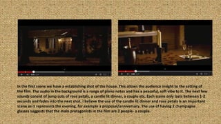 The document provides a detailed summary and analysis of the scenes and techniques used in a film trailer. It describes the establishing shots used at the beginning to set the romantic mood and setting. This is interrupted by a loud crash, changing the tone. Subsequent scenes introduce the antagonists and elements of violence to create suspense and unease. Jump cuts and changing audio are used between shots of the protagonists to build tension without revealing what happens. Text frames are analyzed positively for their transitions, font and ability to engage the audience.
