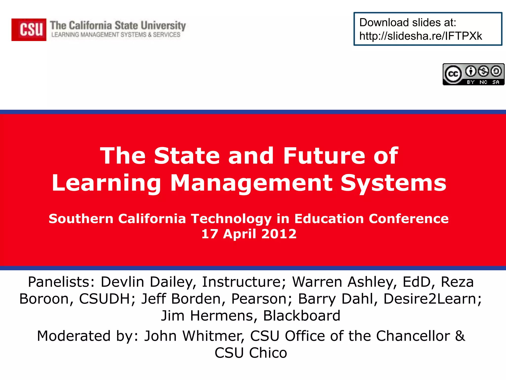 This document summarizes a panel discussion on the state and future of learning management systems (LMS). The panel discussed topics such as high adoption rates of LMS in higher education, the role of social media in the future of LMS, and how technologies like mobile and analytics could impact LMS. One question addressed what a "next generation" LMS might look like and what problems it could solve. Another question discussed why LMS reporting and analytics are currently immature and how they could be improved. The document provides data on LMS usage trends in the California State University system.