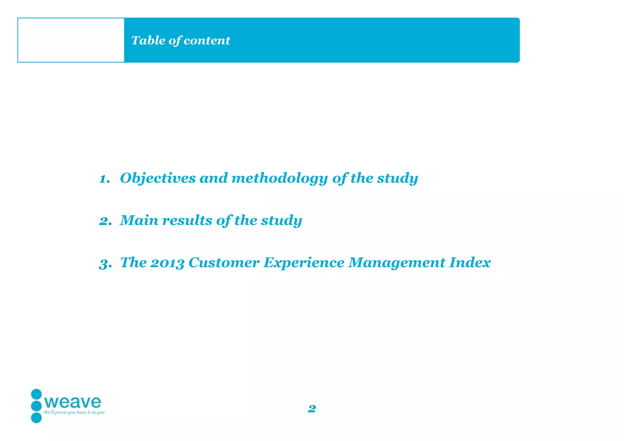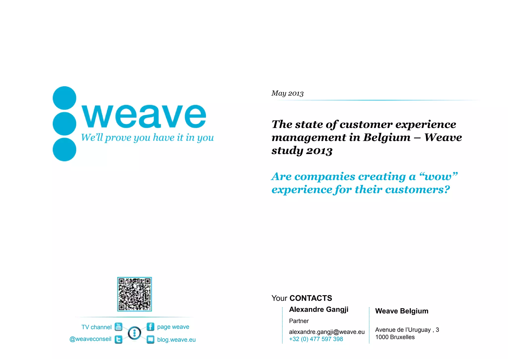 This document presents the results of a study on customer experience management in Belgium conducted by Weave. The study assessed 24 major companies across 4 industries: energy, retail banking, telecommunications, and transportation. The main findings were: