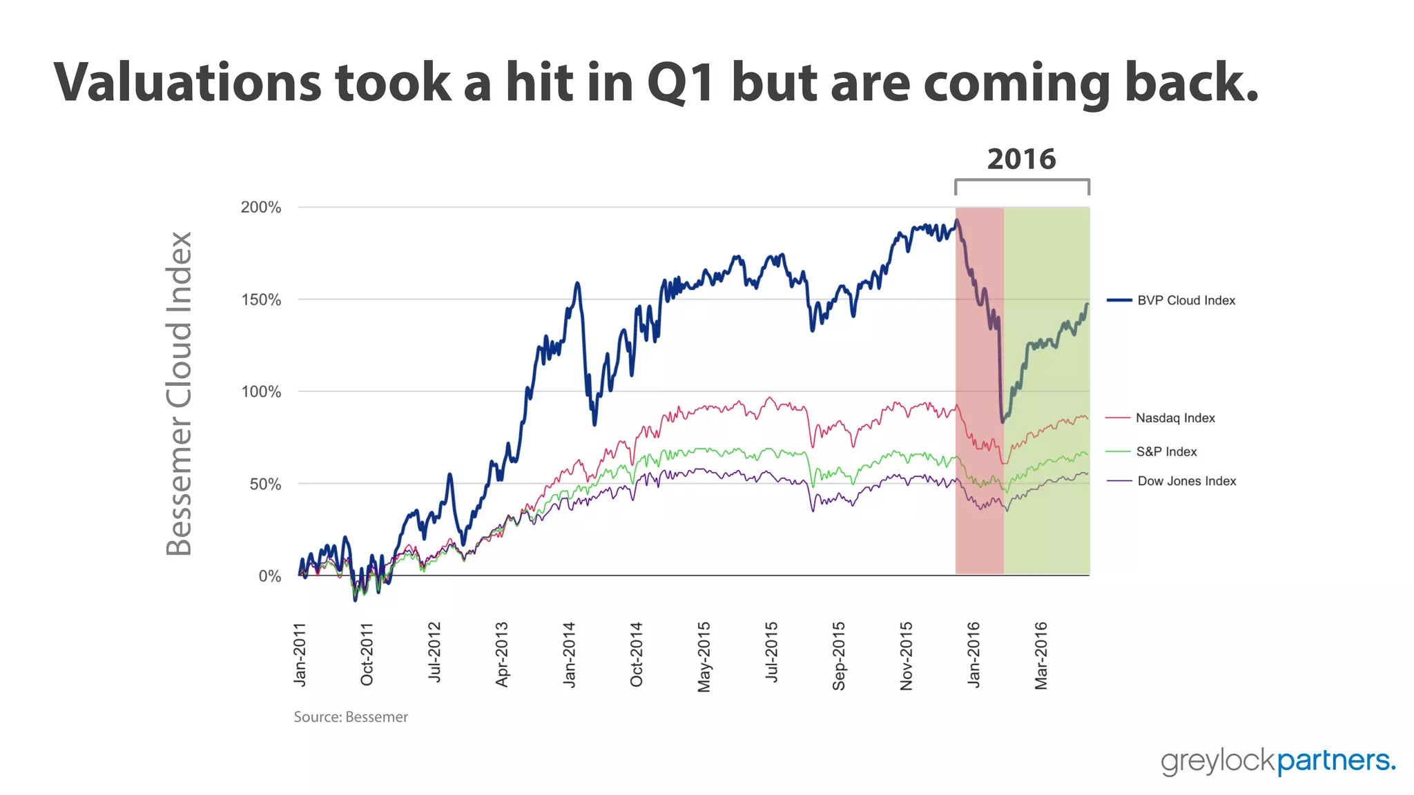 Enterprise software valuations showed a decline in Q1 but are stabilizing at a new normal, with a slowdown in VC deal volume yet sustained interest for strong companies. The startup climate for 2016 encourages long-term planning and a focus on cash positions, while strategic M&A activity is anticipated to rise. Key market areas include infrastructure, security, and evolving applications, with a focus on data, IoT, and machine intelligence driving innovation.