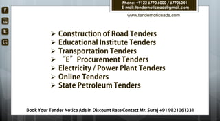 The document provides information about tender notice advertisement booking through www.tendernoticeads.com. It outlines the booking procedure which includes selecting the ad type, emailing the ad content, designing the ad, approving the ad, making payment, and releasing the ad. It encourages booking tender notice ads at a discounted rate by contacting Mr. Suraj at the provided phone numbers and emails.