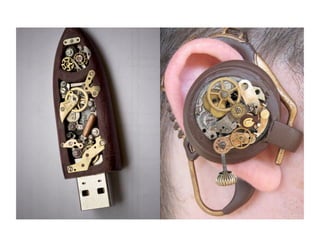 The document discusses a steampunk approach to disruptive technology that draws inspiration from the past to imagine future technologies. It advocates for designing products and experiences that feel personally meaningful by co-designing the future of mobile devices with users. The goal is to make advanced technologies accessible through crafting an understandable illusion of an imagined history and transparent origins that allow users a deeper sense of ownership.