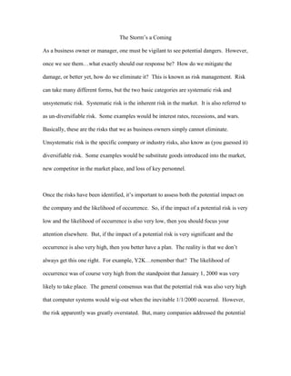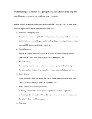 The document discusses risk management for businesses. It identifies two main categories of risk: systematic risk which are uncontrollable market risks like interest rates and recessions, and unsystematic risks which are company-specific like new competitors or loss of key personnel. It emphasizes assessing the likelihood and potential impact of risks to determine which require the most attention. Some options to mitigate risk include developing contingency plans, strengthening internal controls, diversifying revenue sources, evaluating entity structure, using legal agreements, and purchasing insurance. The overall goal of risk management is to identify risks, assess potential damages, and establish systems to address risks.