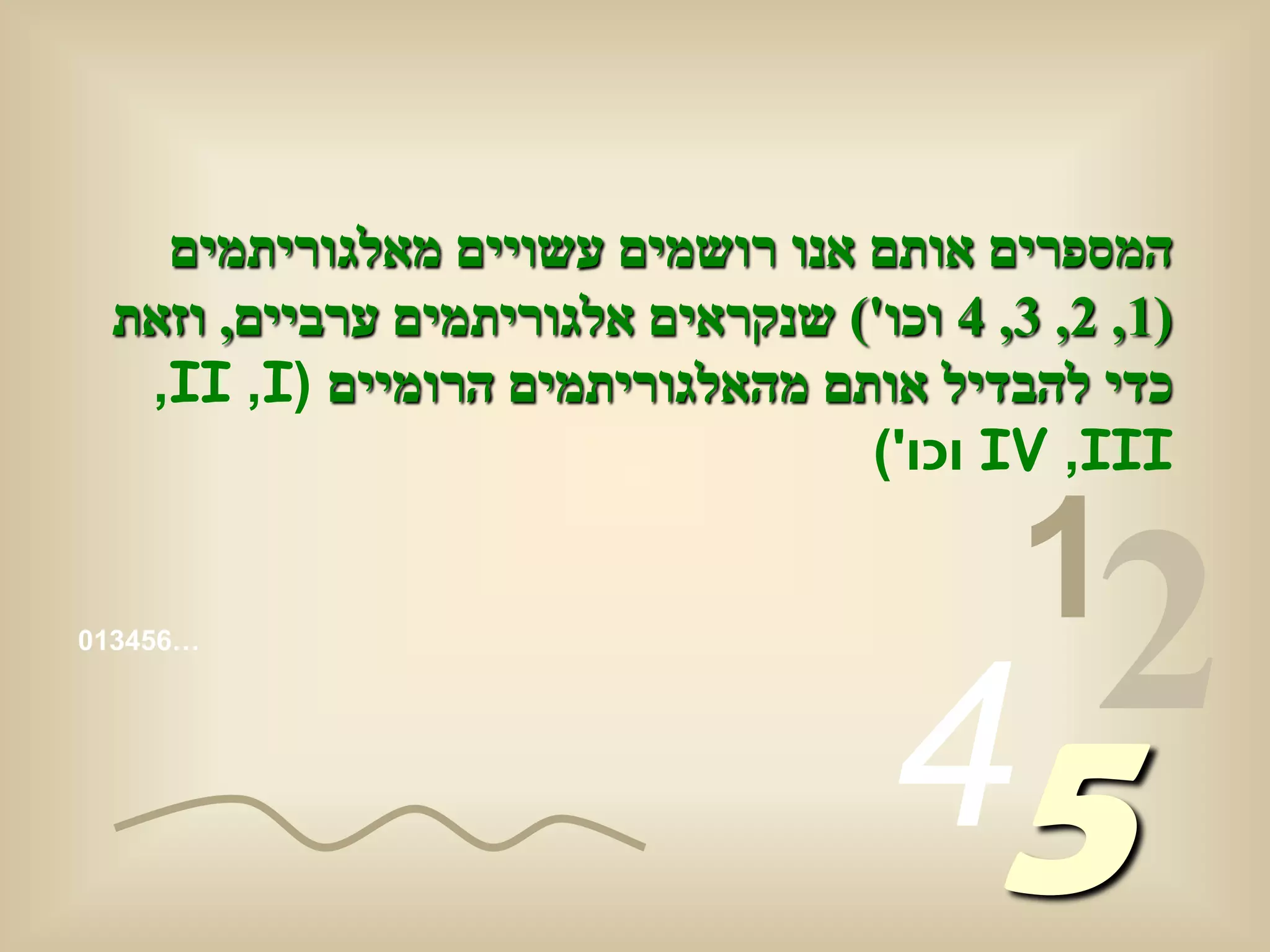 רושמים עשויים מאלגוריתמים (1, 2, 3, 4 וכו') שנקראים אלגוריתמים ערביים, וזאת כדי להבדיל אותם מהאלגוריתמים הרומיים (,II ,I IV ,IIIוכו') 1 …654310 54 2
