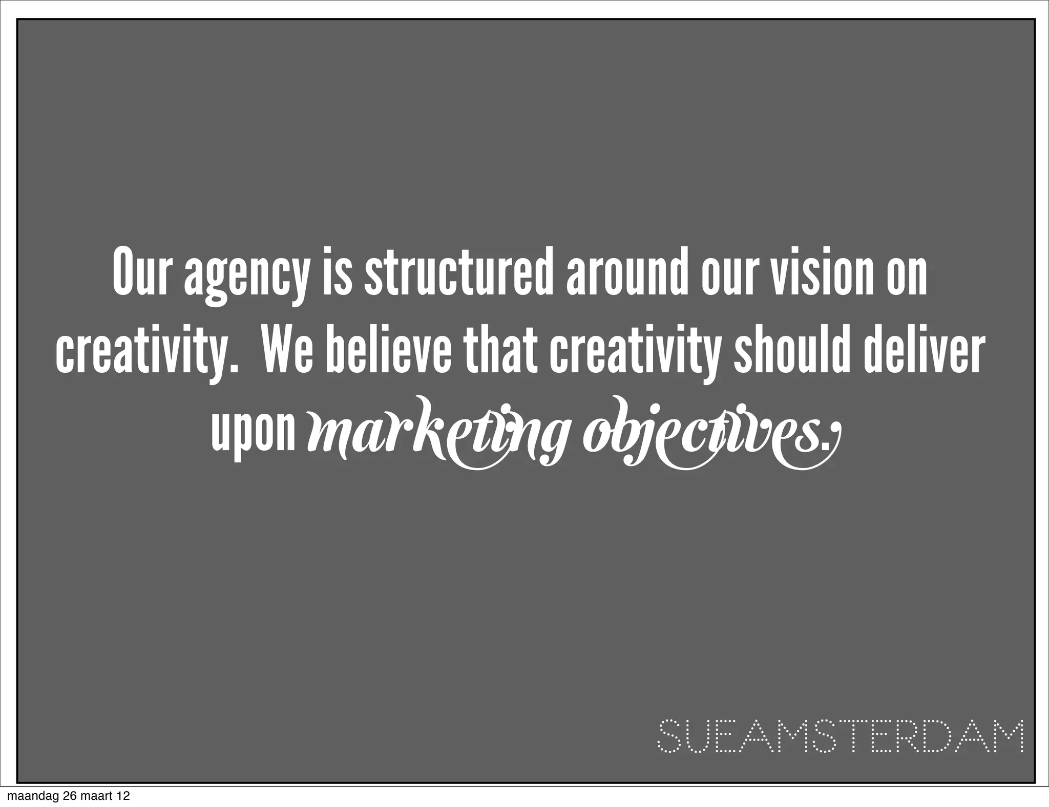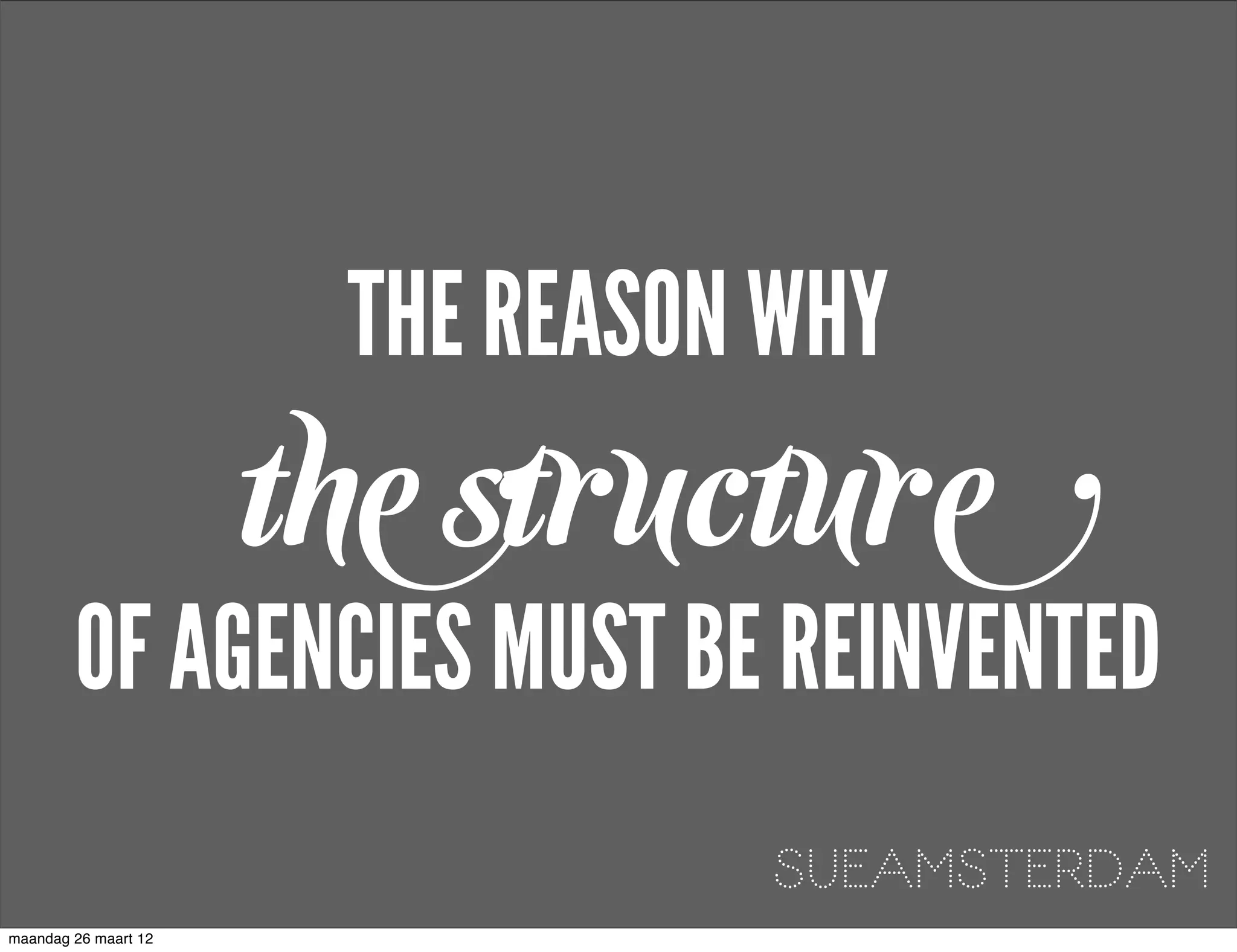 The document discusses the need to reinvent agency structures for the digital age. It argues that agencies must be built around connection and influence on consumer behavior rather than traditional creative teams. The author proposes a flat, horizontal agency structure with multidisciplinary teams that can flexibly work across brands. Each client team would have a director acting as a marketing partner immersed in the client's brand to direct it towards future opportunities.