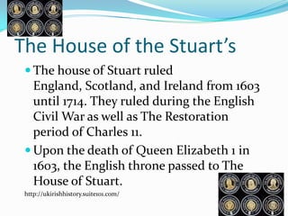 The House of Stuart ruled England, Scotland, and Ireland from 1603 to 1714. Key Stuart monarchs included James I, who inherited the throne from Elizabeth I in 1603; Charles I, who ruled during the English Civil War; and Charles II, who was restored to the throne after the war. The Stuart dynasty continued through the descendants of James II, including Bonnie Prince Charlie. Mary, Queen of Scots struggled between Protestantism and Catholicism and was ultimately executed by her cousin Elizabeth I.