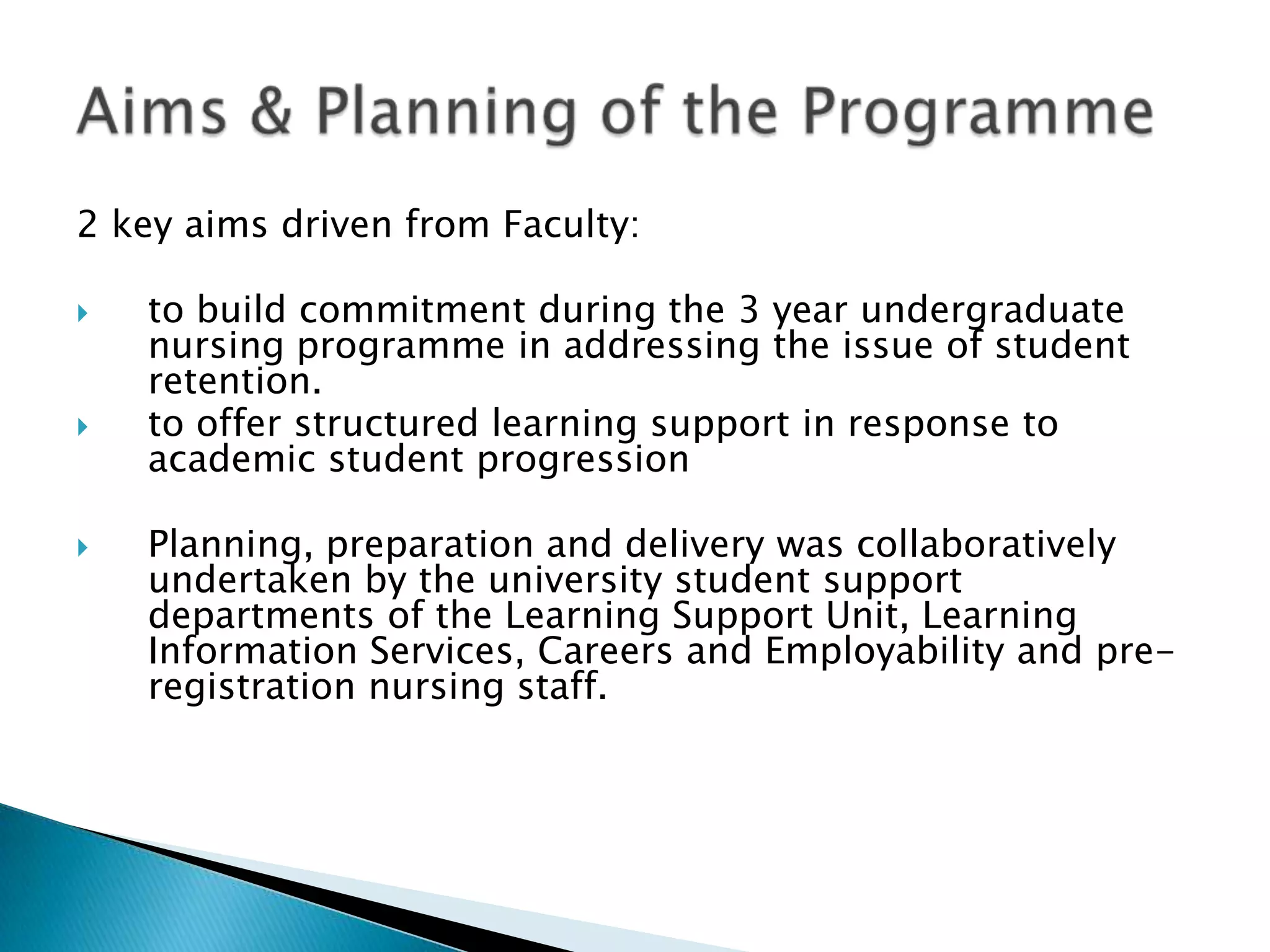 The document describes a student enrichment programme created through inter-professional collaboration at the University of Chester. The programme aimed to improve student retention and academic progression in the undergraduate nursing programme. It involved sessions led by various student support departments, including the library, to provide hands-on learning support. An initial pilot found the experience very positive but attendance was poor due to dispersed sessions. In response, sessions are now mandatory and conducted over a single day across all university sites. The programme has been highlighted as a strength and expanded to additional years of the nursing programme.
