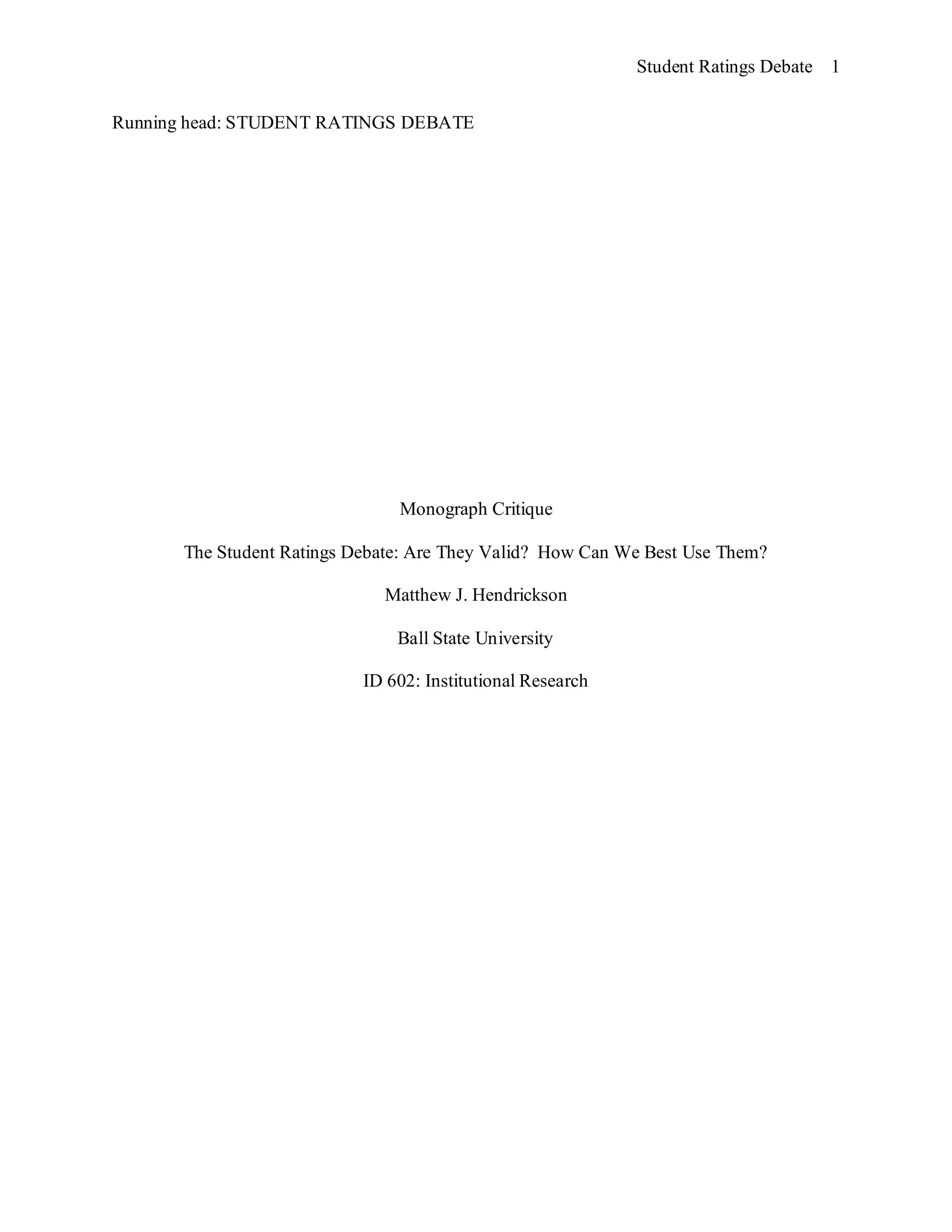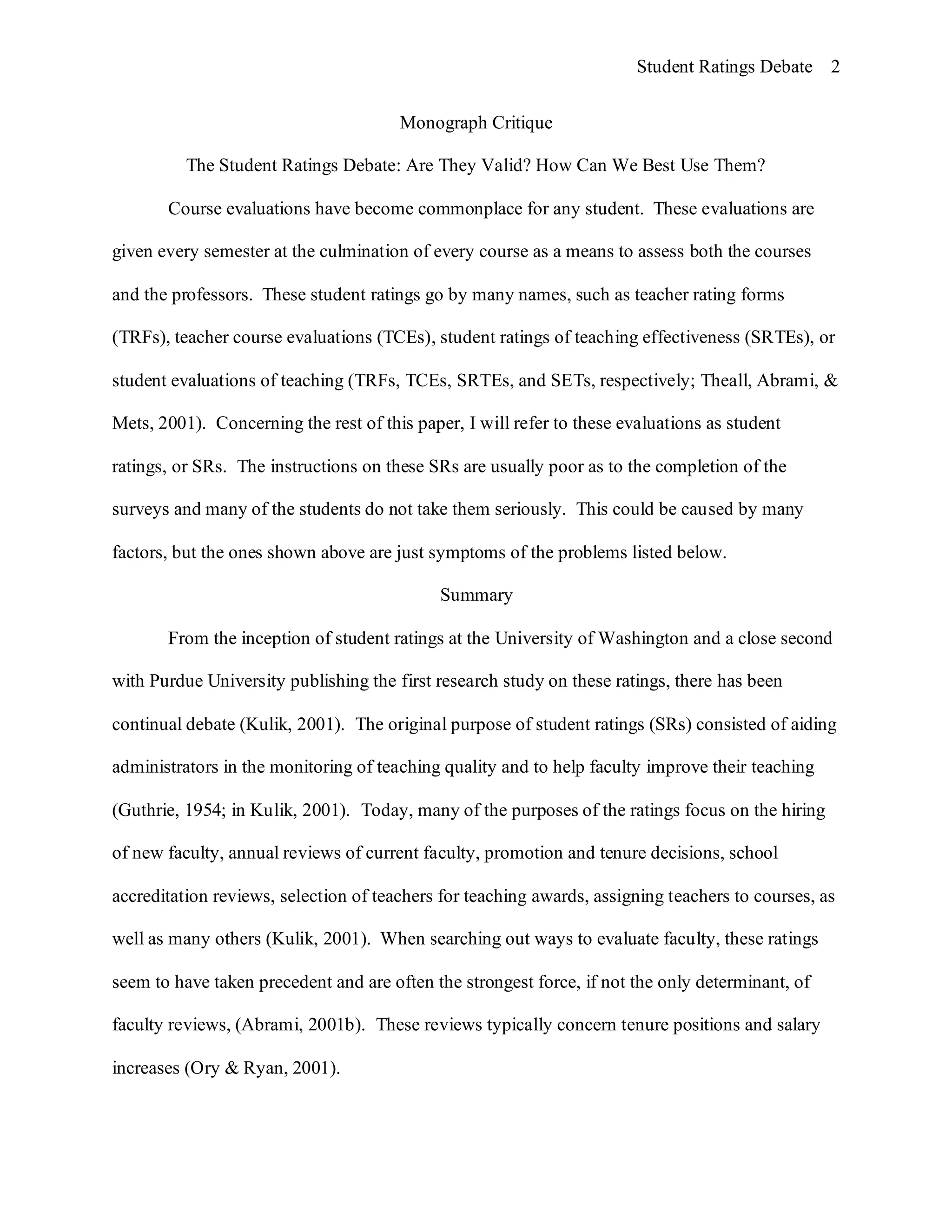 This document summarizes the debate around the validity and appropriate use of student ratings of teaching effectiveness (SRTEs). It discusses the origins and purposes of SRTEs, as well as research examining their validity when compared to other measures of teaching quality like student learning outcomes, comments, and external evaluations. While SRTEs are widely used for hiring and promotion decisions, questions remain around their construct validity and potential for bias. The document argues that addressing issues of definition, interpretation, and complementary evaluation methods could help resolve concerns while still utilizing SRTEs as one aspect of teaching assessment.