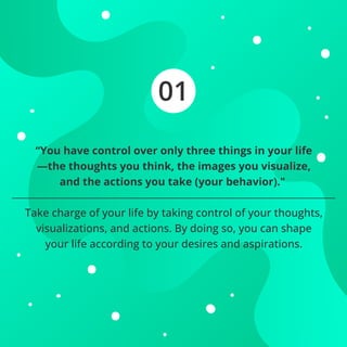 The document outlines five key principles of success from Jack Canfield, emphasizing control over thoughts, visualizations, and actions in shaping one's life. It discusses the law of attraction, the importance of personal growth over material possessions, the strategy of acting as if one has already achieved their goals, and the necessity of taking action to turn knowledge into reality. Overall, these principles advocate for positive thinking, proactive behavior, and personal development as paths to success.