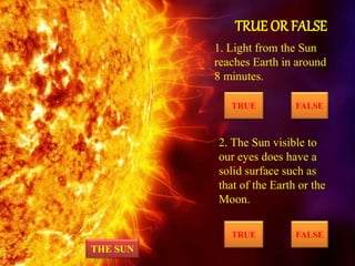 The Sun is by far the largest object in the solar system, containing over 99% of the mass. It has a diameter over 100 times larger than Earth and generates energy through nuclear fusion of hydrogen into helium. Light from the Sun takes approximately 8 minutes to reach Earth. While the visible surface of the Sun appears solid, it actually consists of several layers including the core, radiative zone, convective zone, photosphere, chromosphere, and corona. Solar activity like sunspots, solar flares, and coronal mass ejections can impact power grids and communication systems on Earth. Astronomers study the Sun to better understand stars and how changes in solar output impact Earth's climate and atmosphere.