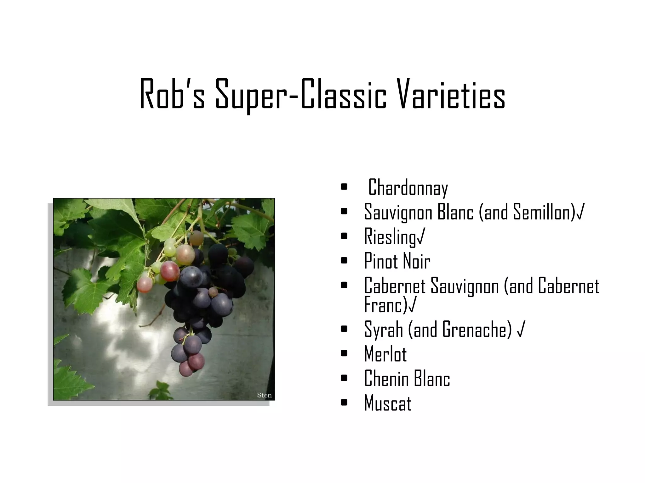 The document discusses classic grape varieties including Chardonnay, Sauvignon Blanc, Riesling, Pinot Noir, Cabernet Sauvignon, Syrah, Merlot, and Chenin Blanc. It contrasts Old World and New World styles, with Old World focusing on terroir and tradition, and New World on experimentation. It provides details on producing regions and recommended food pairings for Chenin Blanc and Merlot, and discusses how dessert wines are made.