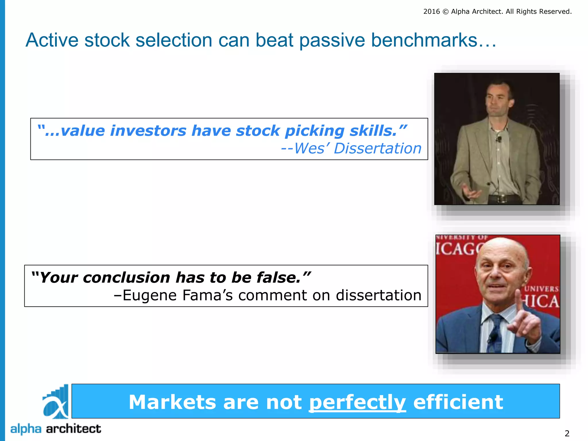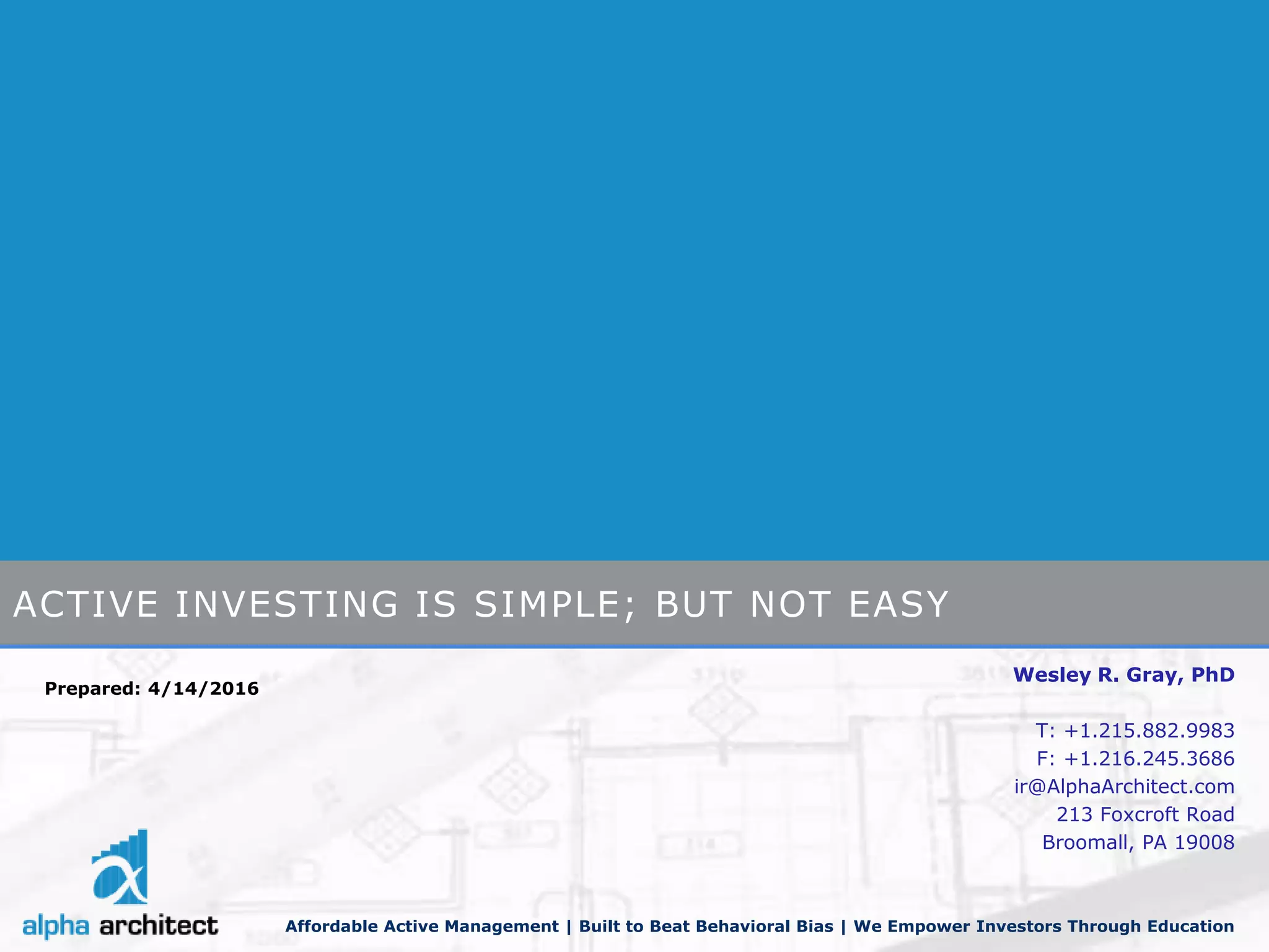 The document discusses the principles of active investing, emphasizing that while it may seem straightforward, it is complicated by human behavioral biases and market inefficiencies. It includes insights on effective strategies, such as focusing on undervalued stocks and the importance of managing investor emotions. Additionally, it warns that hypothetical performance results do not guarantee future success and investors must consider their risk tolerance.