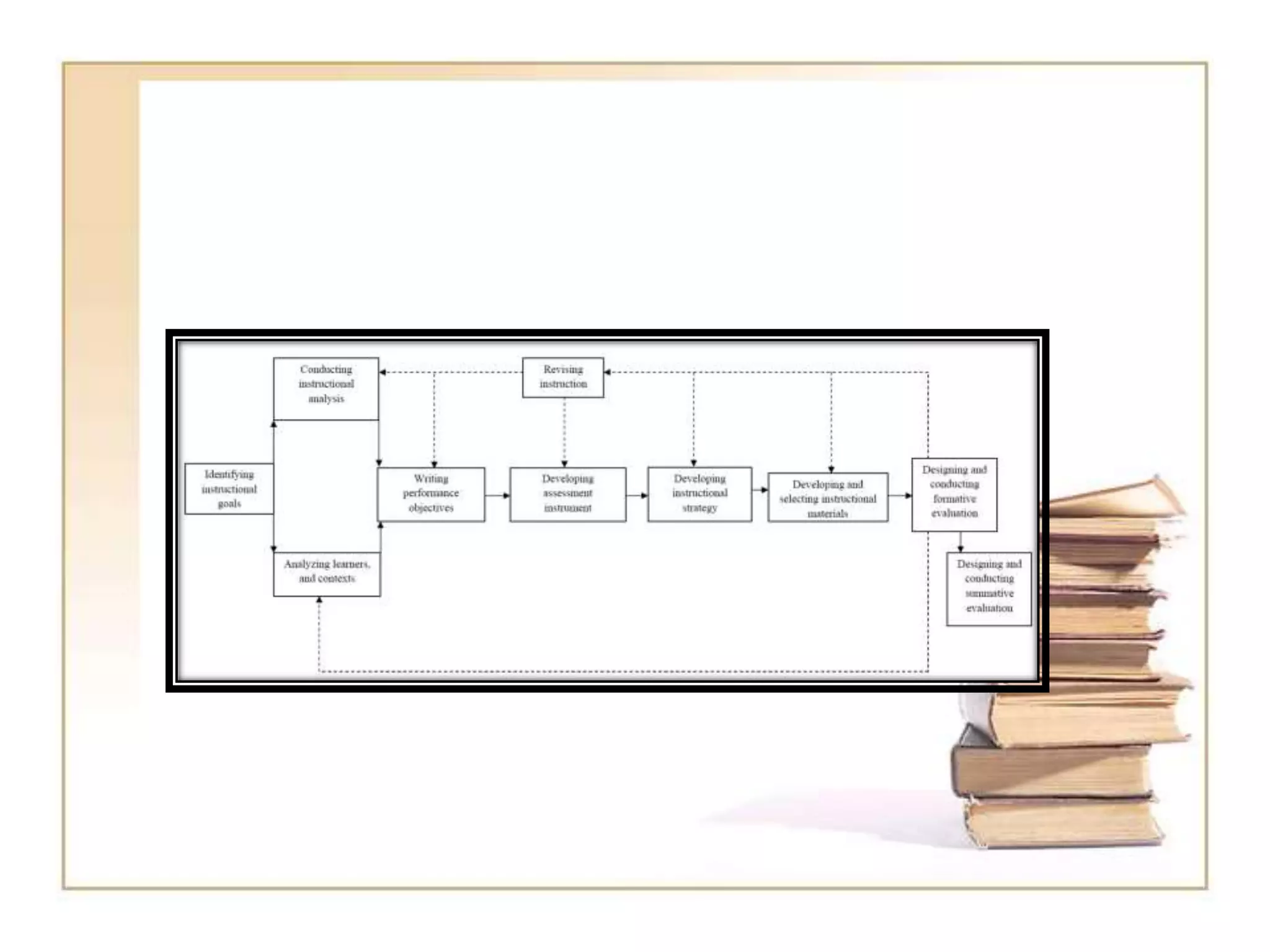 This document outlines the key principles and steps of instructional design according to Dick and Carey's systematic design model. It discusses establishing instructional goals, analyzing the learning context, writing objectives and criterion-referenced tests, developing instructional strategies and materials, and conducting formative evaluations to revise instruction. The goal is to design effective instruction by thoroughly analyzing learning needs and contexts, developing appropriate objectives and assessments, selecting optimal instructional approaches, and refining the design through evaluation and revision.