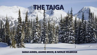 The taiga biome has long, cold winters and short, cool summers with low precipitation. It is dominated by coniferous trees like spruce, fir, and pine that are adapted to the climate with needle-like leaves and thick bark. Common animal species include bears, wolves, lynx, and birds that have insulating fur or feathers. The taiga stores a large amount of carbon and covers a significant portion of the northern hemisphere.