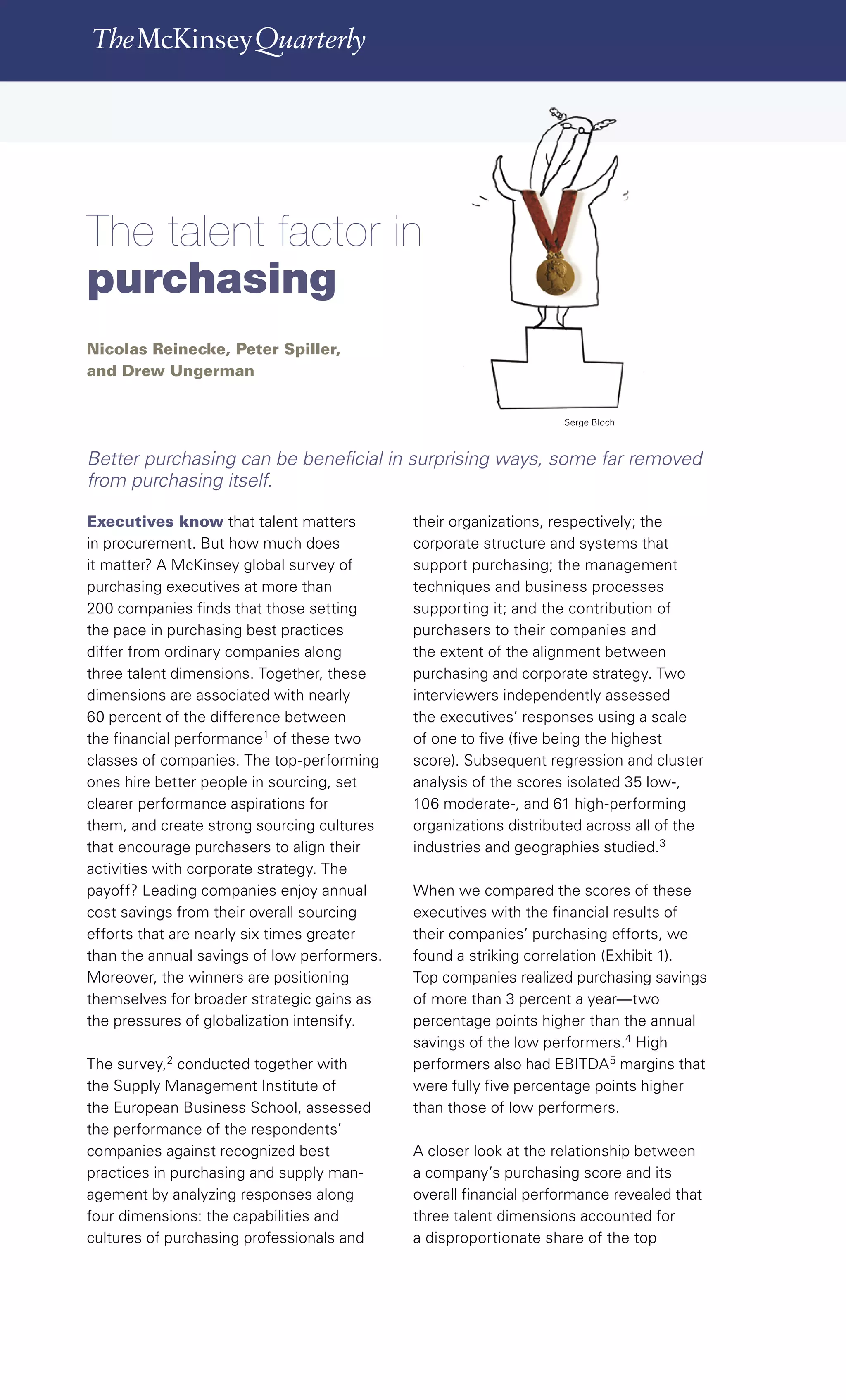 The document discusses the significant impact of talent on procurement and purchasing performance across organizations. A study reveals that high-performing companies attribute 60% of their superior financial performance to better sourcing practices, driven by talented purchasing professionals who align with corporate strategy. It emphasizes the importance of management and fostering a sourcing culture to achieve higher savings and operational efficiency in purchasing.