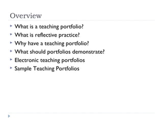 The document outlines the concept of a teaching portfolio, defined as a collection of materials showcasing a faculty member's teaching practice and its impact on student learning. It emphasizes the importance of reflective practice in developing the portfolio and provides recommendations for its content, including personal reflections, course materials, and methodologies. Additionally, it distinguishes between traditional and electronic portfolios and encourages ongoing revisions to demonstrate growth as an educator.