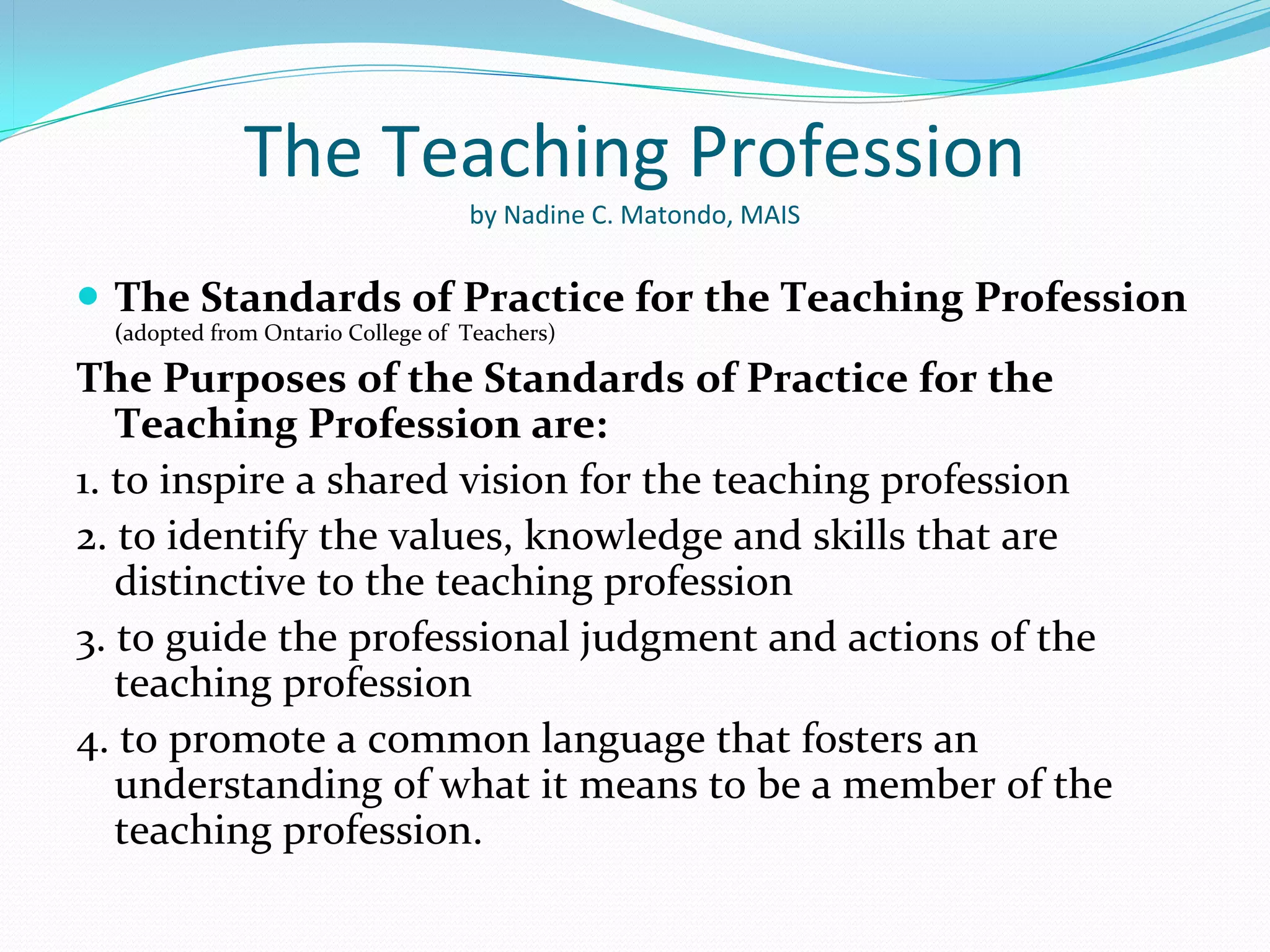 The document discusses the teaching profession and the standards of practice for teachers. It outlines the purposes of the standards as inspiring a shared vision, identifying distinctive values/skills, guiding professional judgment, and promoting a common language for teachers. The standards themselves are a commitment to students and learning, professional knowledge, professional practice, ongoing learning, and leadership in learning communities. The document emphasizes that no teacher stands alone and that teachers shape society through their work with students.