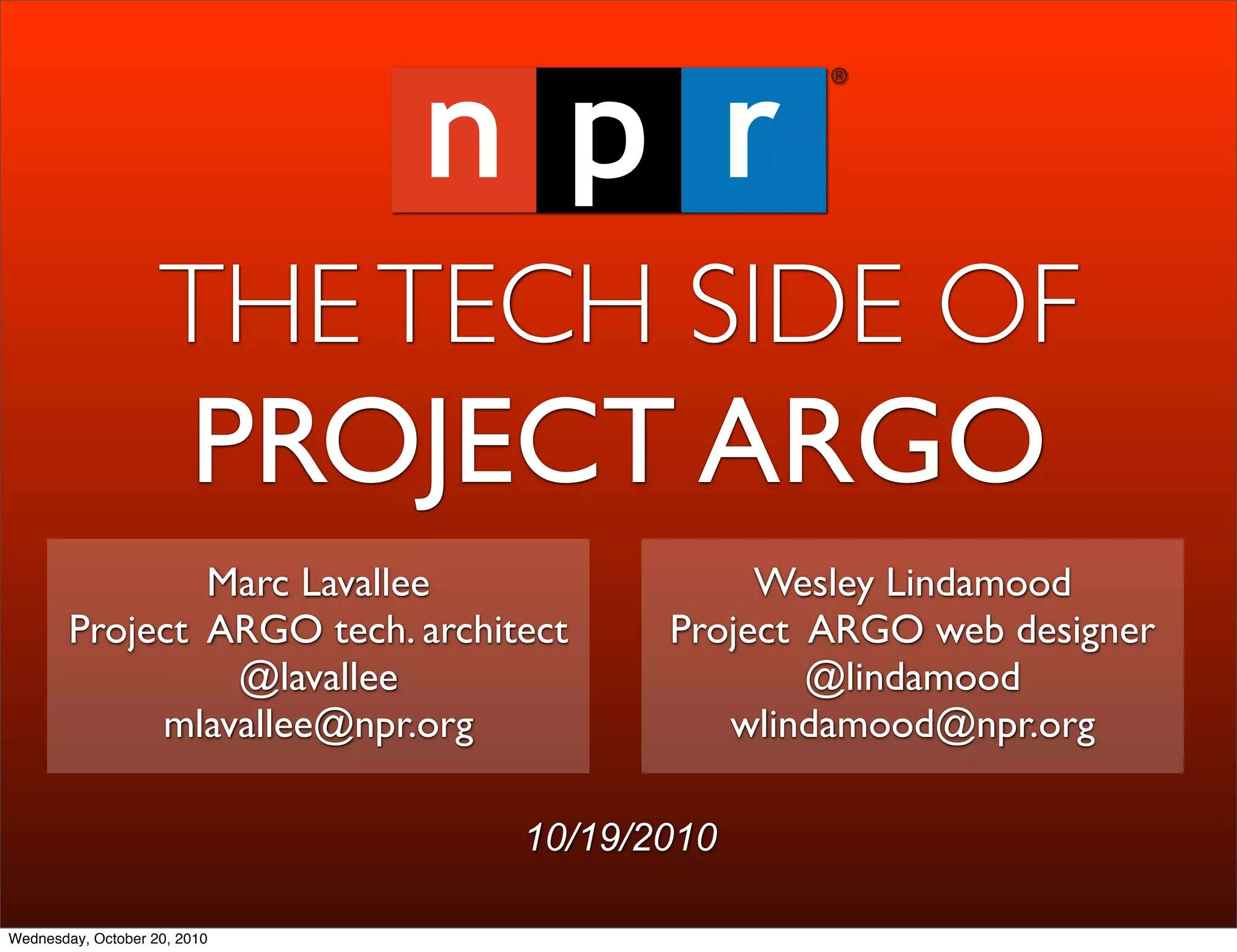 The document summarizes Project ARGO, an NPR initiative to create a network of 12 topical websites staffed by a single blogger/editor associated with an NPR member station. It describes the WordPress-based platform used, which includes customizations for features like audio posts, taxonomies, menus and templates. It also outlines the hosting infrastructure using Amazon Web Services and strategies for performance, caching and aggregation across sites.