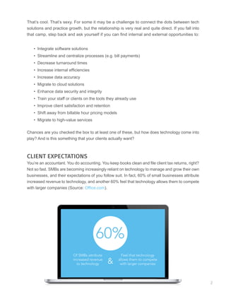 The document discusses the evolving role of accountants in the age of technology, highlighting how small and medium-sized businesses (SMBs) are increasingly relying on tech solutions for growth and efficiency. It emphasizes the need for accountants to integrate modern tools, streamline processes, and maintain alignment with client expectations, as many businesses now view technology as essential for competitiveness. Ultimately, it calls for accountants to embrace these changes to enhance their service offerings and adapt to a rapidly changing economic landscape.