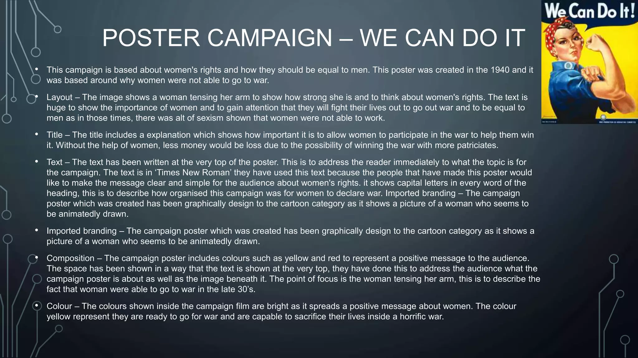 The document analyzes and compares three graphic design campaigns: a poster campaign from the 1940s promoting women's rights, a website campaign for cycling safety, and a moving image public service announcement about a boy hit by a car.