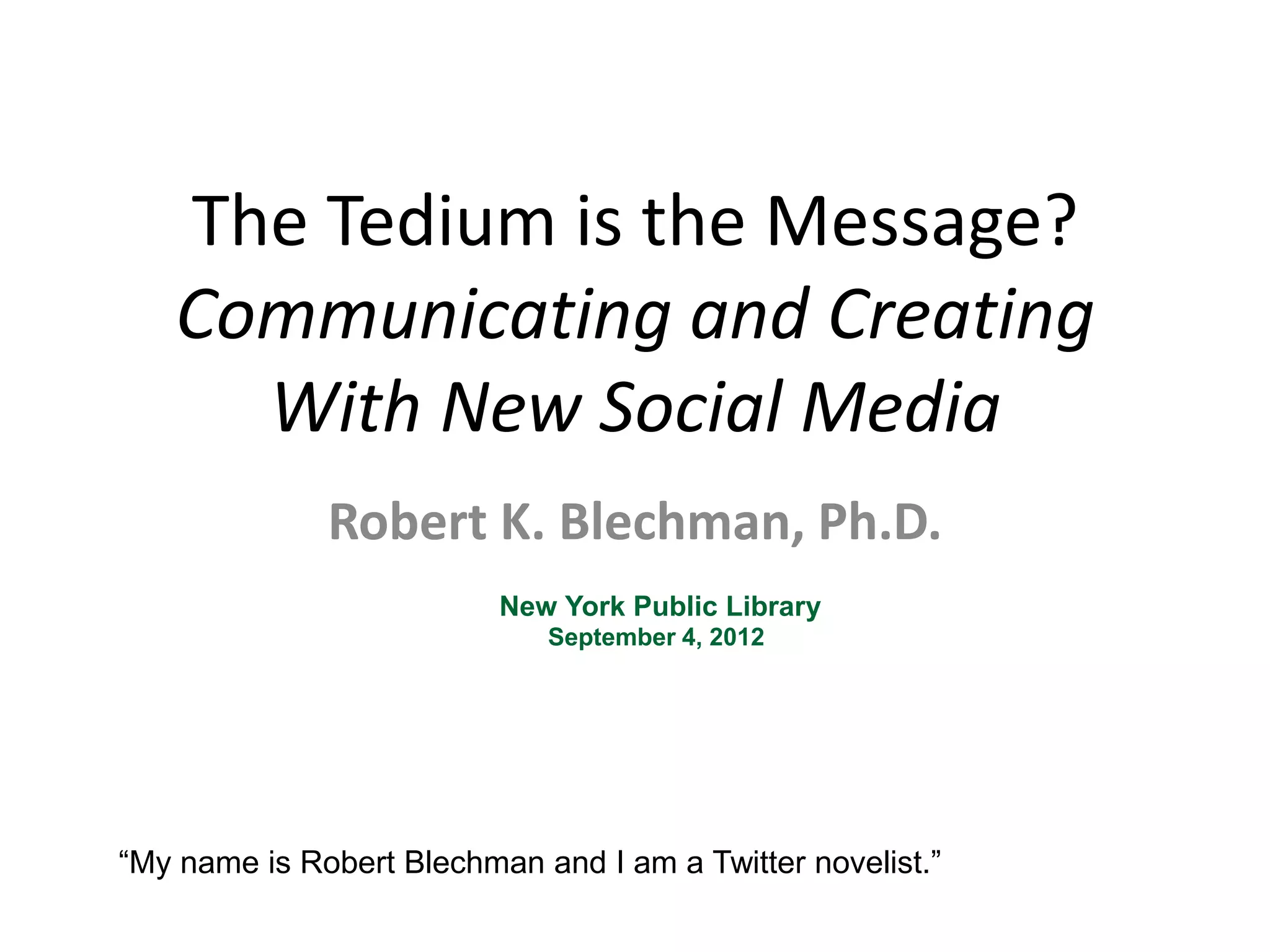 Robert K. Blechman discusses the influence of new social media, particularly Twitter, on communication and creativity, paralleling this with the effects of historical media like the printing press. He explores the potential downsides of Twitter in fostering superficial interactions, yet argues for its potential to democratize storytelling and literature. Ultimately, he presents his own narrative experiment, 'Executive Severance,' crafted within the constraints of Twitter's format.