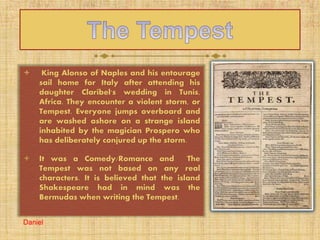 King Alonso of Naples and his entourage are shipwrecked on an island after a tempest conjured by the magician Prospero, who seeks revenge on those who usurped his dukedom. Key characters include Prospero, his daughter Miranda, and the spirit helper Ariel, alongside the usurpers who face their reckoning. Ultimately, Prospero forgives Alonso and his companions, inviting them to stay before they return to Italy, marking a resolution to the conflict.