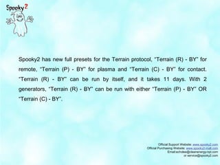 Spooky2 has released new full presets for the terrain protocol, including options for remote, plasma, and contact use. Users can run combinations of these presets with one or two generators, following specific schedules and instructions. The official support and purchasing websites are provided for further assistance.