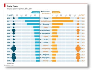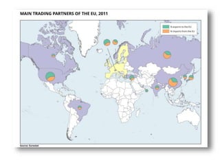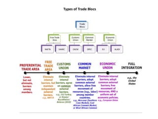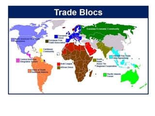 The document discusses the tertiary sector, emphasizing its services, including transport, tourism, trade, telecommunications, banking, education, and healthcare. It contrasts the tertiary sector with the quaternary sector and highlights the characteristics and types of trade, including domestic and international trade. Additionally, it outlines trading blocs, their benefits, drawbacks, and key examples like NAFTA and the EU.