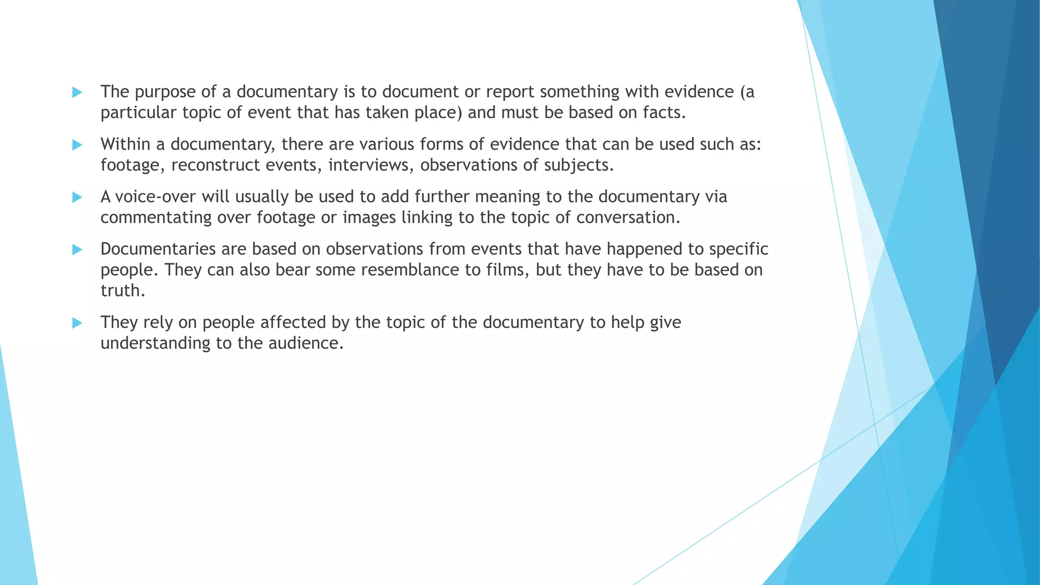 The document summarizes the key elements and purposes of documentaries. It discusses that documentaries must be based on facts and use evidence such as footage and interviews to document real events. It also describes different types of documentaries such as fully narrated, observational, mixed, and docudramas. Additionally, it outlines narrative conventions for documentaries including having an exposition, beginning with intrigue, a complication middle, and a resolution ending.