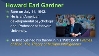 Howard Gardner is an American psychologist who proposed the theory of multiple intelligences in his 1983 book Frames of Mind. He defines intelligence as the ability to solve problems or create products that are valued within a culture. Gardner identified nine distinct intelligences: linguistic, logical-mathematical, spatial, bodily-kinesthetic, musical, interpersonal, intrapersonal, naturalist, and existential. The theory of multiple intelligences suggests that individuals possess combinations of these intelligences in different amounts and that teaching methods should target a wide variety of student strengths to promote learning.