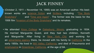 Jack Finney was an American author best known for his science fiction and thriller novels, including The Body Snatchers and Time and Again. The Body Snatchers was adapted into the 1956 film Invasion of the Body Snatchers. The short story The Third Level is about a man named Charley who wishes to time travel to 1894, which he believes would be a happier and quieter time. The story explores the themes of escapism from the present through psychological refuge in the past or desire to keep the past alive in the complexities of the present. Grand Central Terminal is a major commuter hub and tourist attraction in New York City, known for its architecture and large main concourse area serving over 200,000 daily comm
