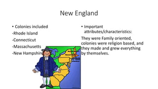 The document discusses the 13 original colonies in North America and some of their key attributes. It divides the colonies into three regions: New England colonies which were family-oriented and religion-based; Middle colonies which were more socially and religiously diverse; and Southern colonies which focused on family and agriculture. It then briefly outlines the triangular trade route that developed between the colonies, as well as two major cultural events that influenced colonial life - the Great Awakening religious revival and the spread of Enlightenment thinking.