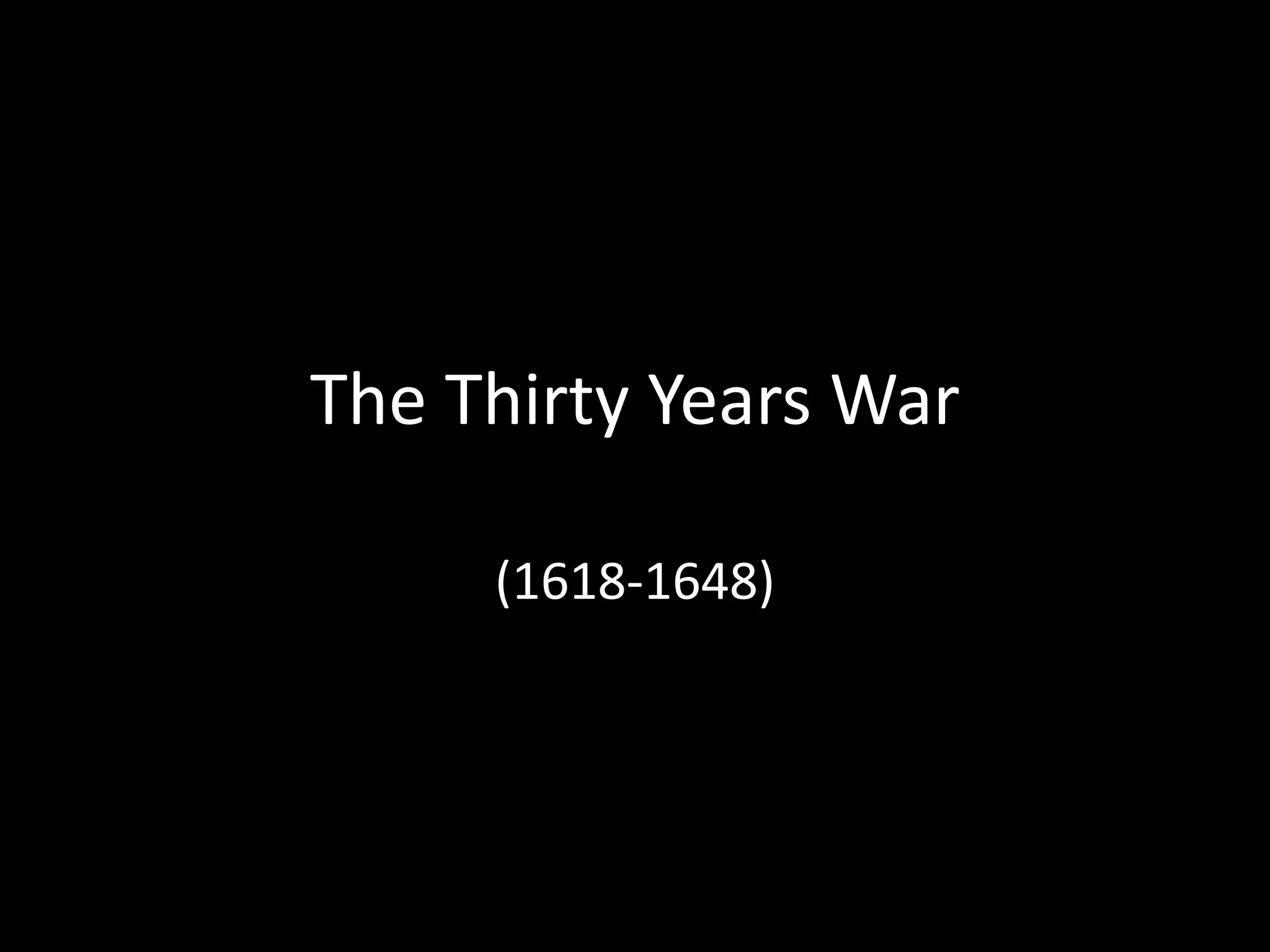The Thirty Years War (1618-1648) was a conflict fought primarily in Germany between Catholics and Protestants. While religious differences played a role, the goals of the various powers involved were mainly geopolitical, such as German princes seeking autonomy and France attempting to limit Hapsburg power. The war occurred in phases involving Bohemia, Denmark, Sweden, and finally France and Sweden against Spain and the Holy Roman Empire. It culminated in the Peace of Westphalia, which granted sovereignty to German princes and greater religious tolerance while curbing Hapsburg power. The war devastated Germany and marked the end of the age of religious wars in Europe.