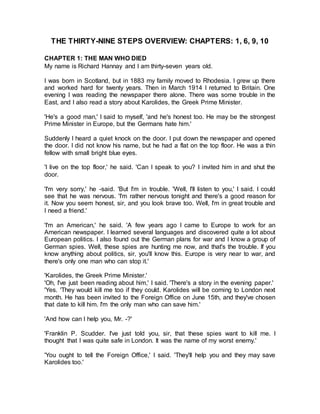 The document provides an overview of chapters 1, 6, 9, and 10 from the novel "The Thirty-Nine Steps" by John Buchan. It describes the main character Richard Hannay encountering a mysterious American man who is being hunted by German spies. After the American is murdered, Hannay finds himself on the run from the police and the German spies. He discovers the spies have a secret airfield located on a farm and works to escape their capture.