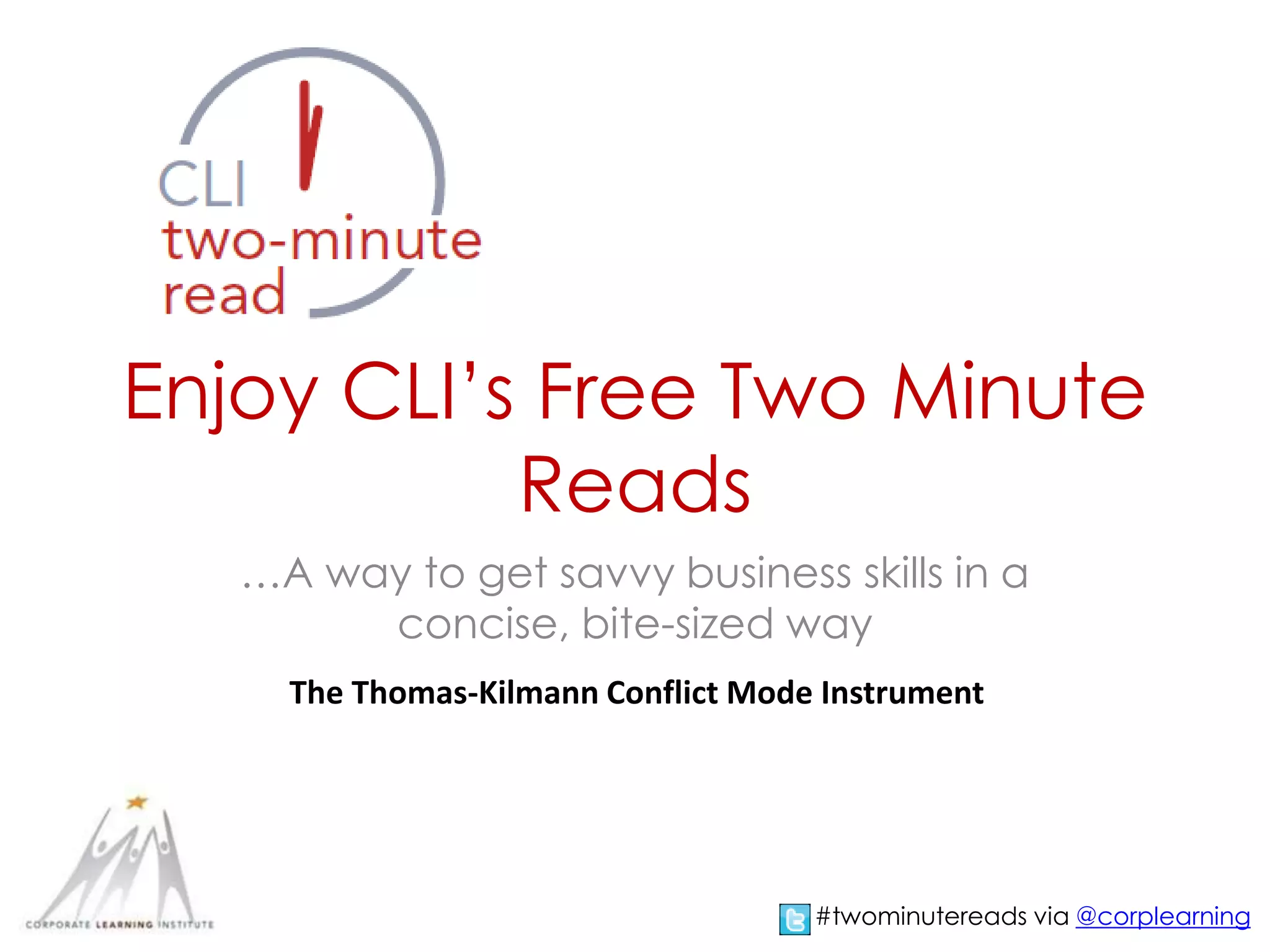 The document introduces enjoy cli's free two-minute reads aimed at enhancing business skills, focusing notably on the Thomas-Kilmann Conflict Mode Instrument that identifies five conflict styles: competing, accommodating, avoiding, collaborating, and compromising. Each style is described along dimensions of assertiveness and cooperativeness, outlining when each approach is most effective. Additionally, basic conflict resolution skills are emphasized to improve team dynamics and overall organizational effectiveness.