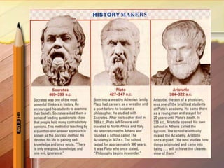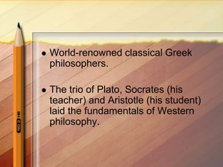 Socrates, Plato, and Aristotle formed a great triumvirate of classical Greek philosophers. Socrates used questioning to teach virtue, Plato was his student and wrote dialogues featuring Socrates, and Aristotle was Plato's student who went on to tutor Alexander the Great and founded his own school. Together, they laid the fundamentals of Western philosophy through Socrates' teachings, Plato's dialogues and ideas of forms, and Aristotle's writings on logic, happiness, and moderation.