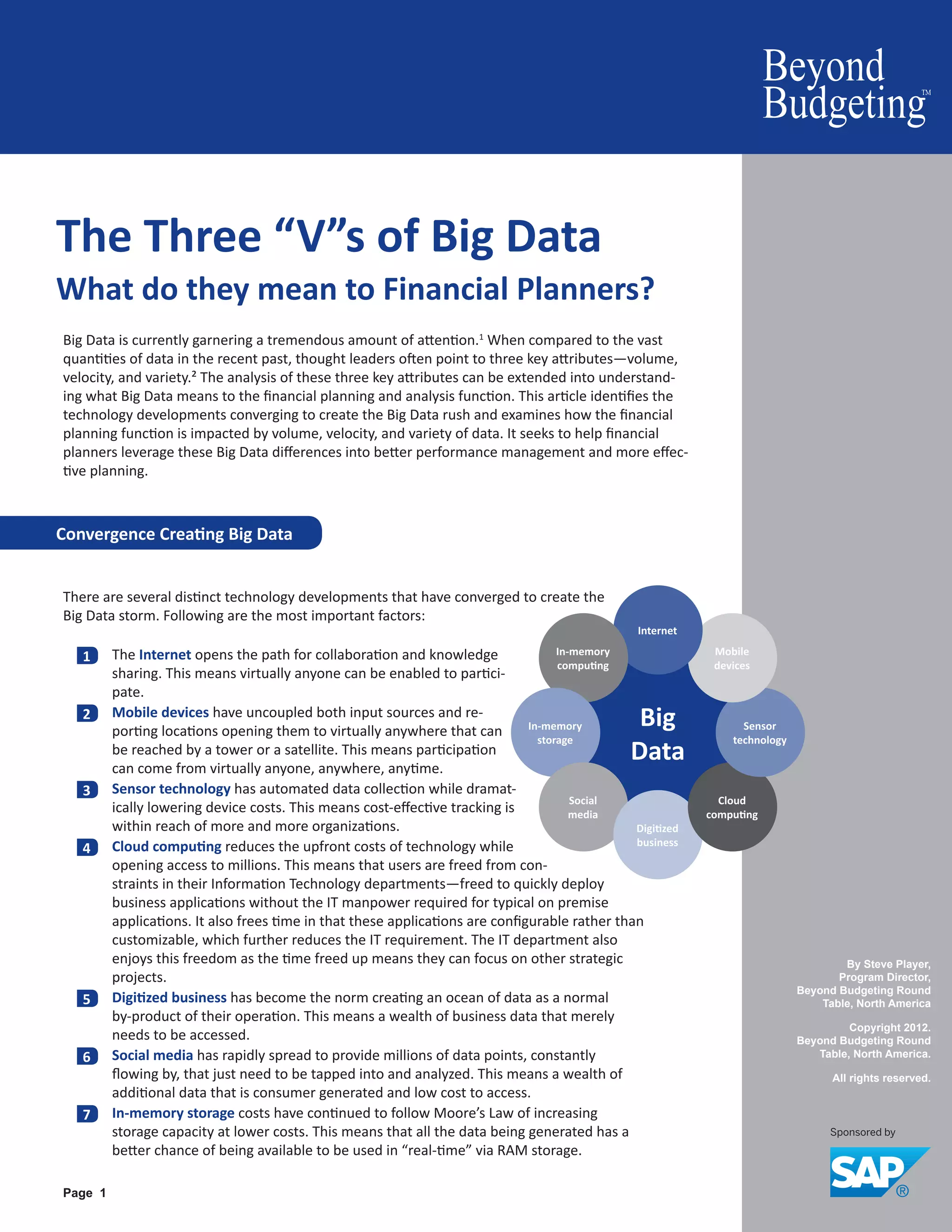 This document discusses the impact of big data on financial planning, focusing on the three V's: volume, velocity, and variety. It highlights key technological developments enabling the big data rush and emphasizes the importance of leveraging this data for enhanced performance management. Financial planners are encouraged to adapt their strategies to effectively utilize big data for better insights and decision-making.