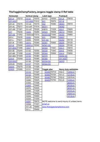 X Ref table Horizontal Vertical clamp Latch type Push/pull 201-A 70210 101-A 70310 43101 70550 301-A 70818 201-ASS 101-ASS 71012 451 70570 301-B 201-AI 70215 101-AI 70315 452 70580 36003 70815 201-AL 70211 101-AIT 71014 40371 36092 201-AR 71001 101-AT 70320 43810 71039 302-F 70820 201 70230 13005 70280 40323 70558 36010 70840 201-SS 71002 13005-SS71015 40323-SS71040 36330 70860 201-I 70235 12050 70330 431 70560 30607 201-L 70231 12055 70335 431-SS 36202 70118 201-R 71003 12070 70340 40341 70562 36204 70120 201-B 70240 12050-U 70342 40341-SS 36224 70140 201-BSS 71006 13007 40324 71041 304-C 70810 201-BI 70245 12140 70350 40334 71042 304-E 70830 201-BS 71008 12145 70355 40344 70565 304-H 70850 201-BSI 71009 12130 70380 40370 36204-SS 225-D 70250 12135 70385 40380 301-ASS 225-DSS 12136 71024 40334-SS 36070 225-DI 70255 12137 71025 40344-SS 20235 70270 12138 71026 20820 70285 12131 70390 Toggle plier Heavy duty weldables 12133 71027 50350 70710 702-C 12050-A 12132 70395 50360 70720 701-C 12130-A 12275 70420 50380 70740 702-D 12275-A 12280 70425 50450 70750 701-D 12265-A 12300 71028 36003-A 12265 70440 36330-A 12270 70445 36301-A 12290 71029 10101-A 12285 70450 10247-U 10249 70460 12132-A 10250 71030 10247 70470 NOTE:welcome to send inquiry of unlised items. 10248 71031 email us 101-JS 70480 www.thetoggleclampfactory.com 101-J 70490